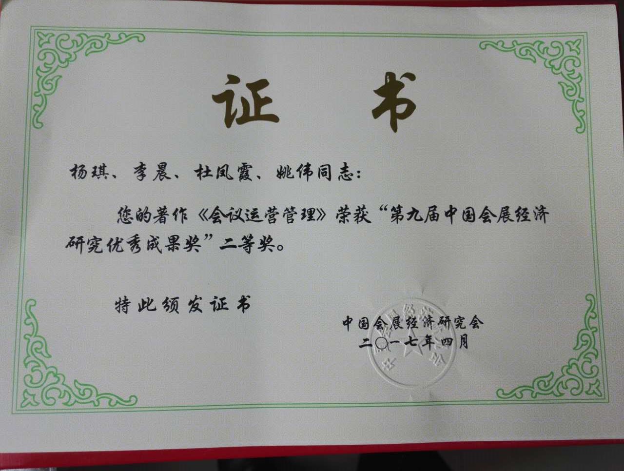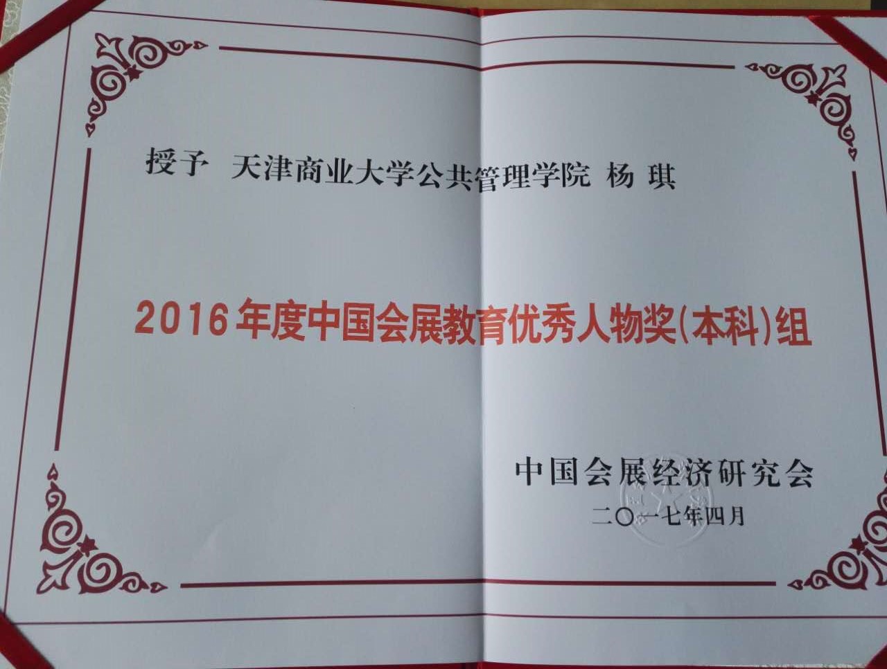 本届年会评奖中,会展系主任杨琪荣获“2016年度中国会展教育优秀人物奖”,是第三次获得此项荣誉;杨琪、李晨、杜凤霞、姚伟合著的著作《会议运营管理》荣获第九届中国会展经济研究优秀成果(著作类)二等奖。