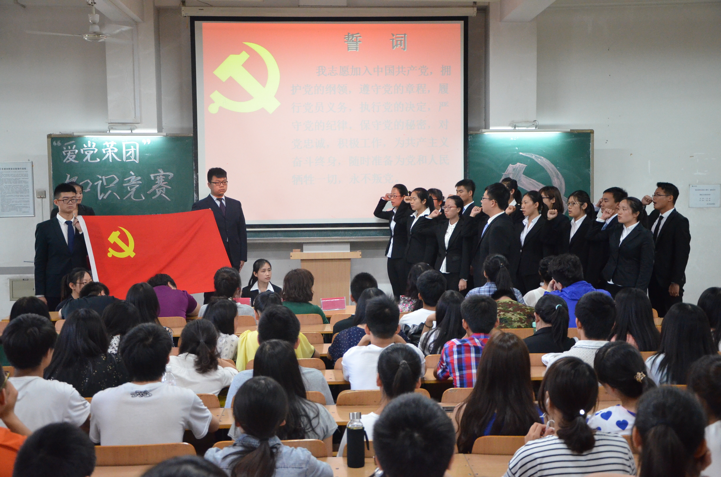 5月20日,bv伟德国际1946官网爱党荣团知识竞赛暨新党员入党宣誓仪式在3号教学楼118室举办,bv伟德国际1946官网辅导员孙瑶、沈洁、仉雅琼老师及2013级研究生党支部书记石慧、第三员工党支部书记武杭出席并担任竞赛评委。2014级近200名同学参加本次活动。