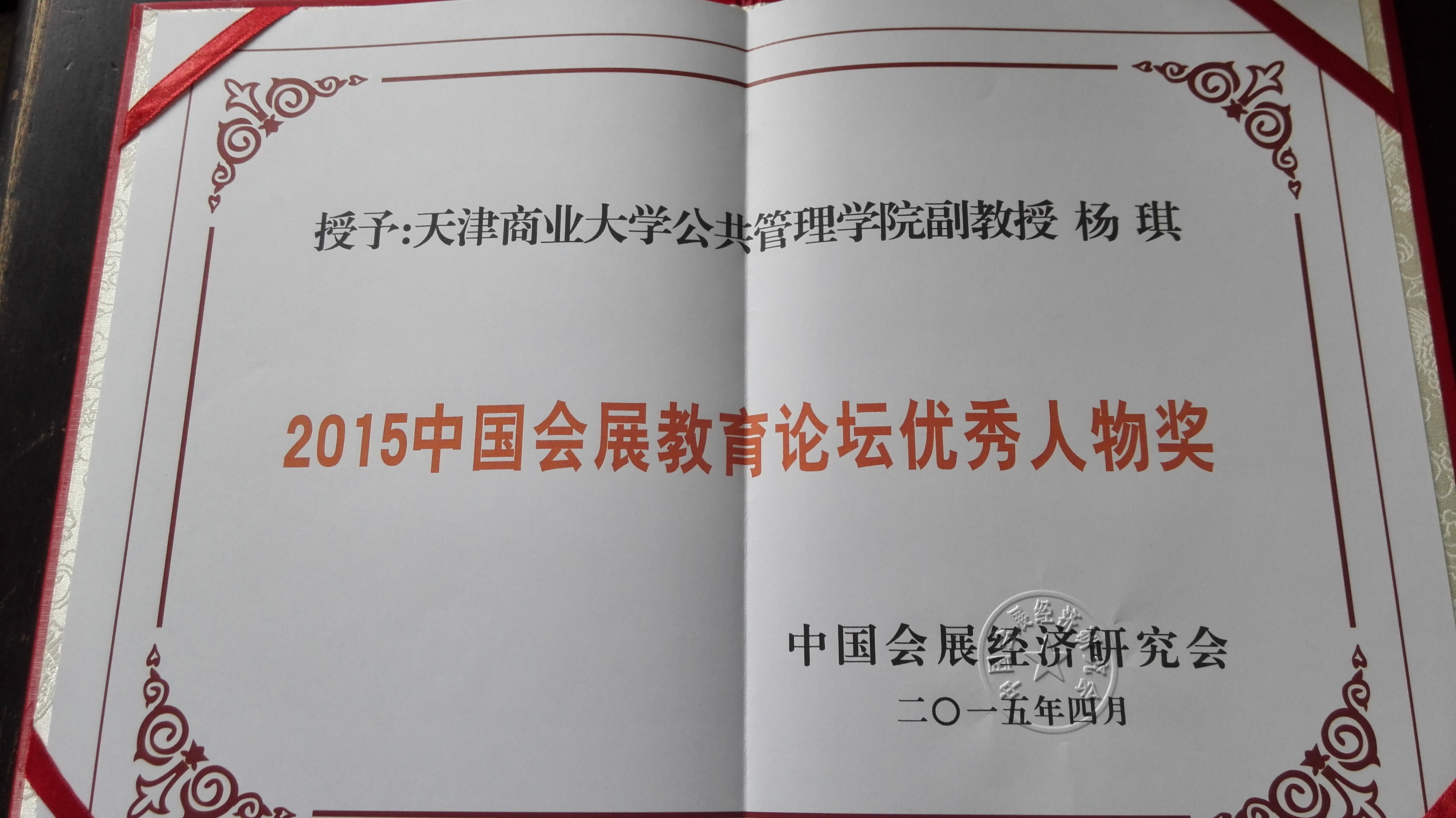 本届年会上,杨琪博士荣获2015年度中国会展教育论坛优秀人物奖。公司会展经济与管理专业获得由中国会展经济研究会颁发的《优秀院校奖》。该奖项的获得说明公司会展经济与管理专业在公司产品上的改革与发展取得的成效及专业建设、科研水平、人才培养等方面得到认可。