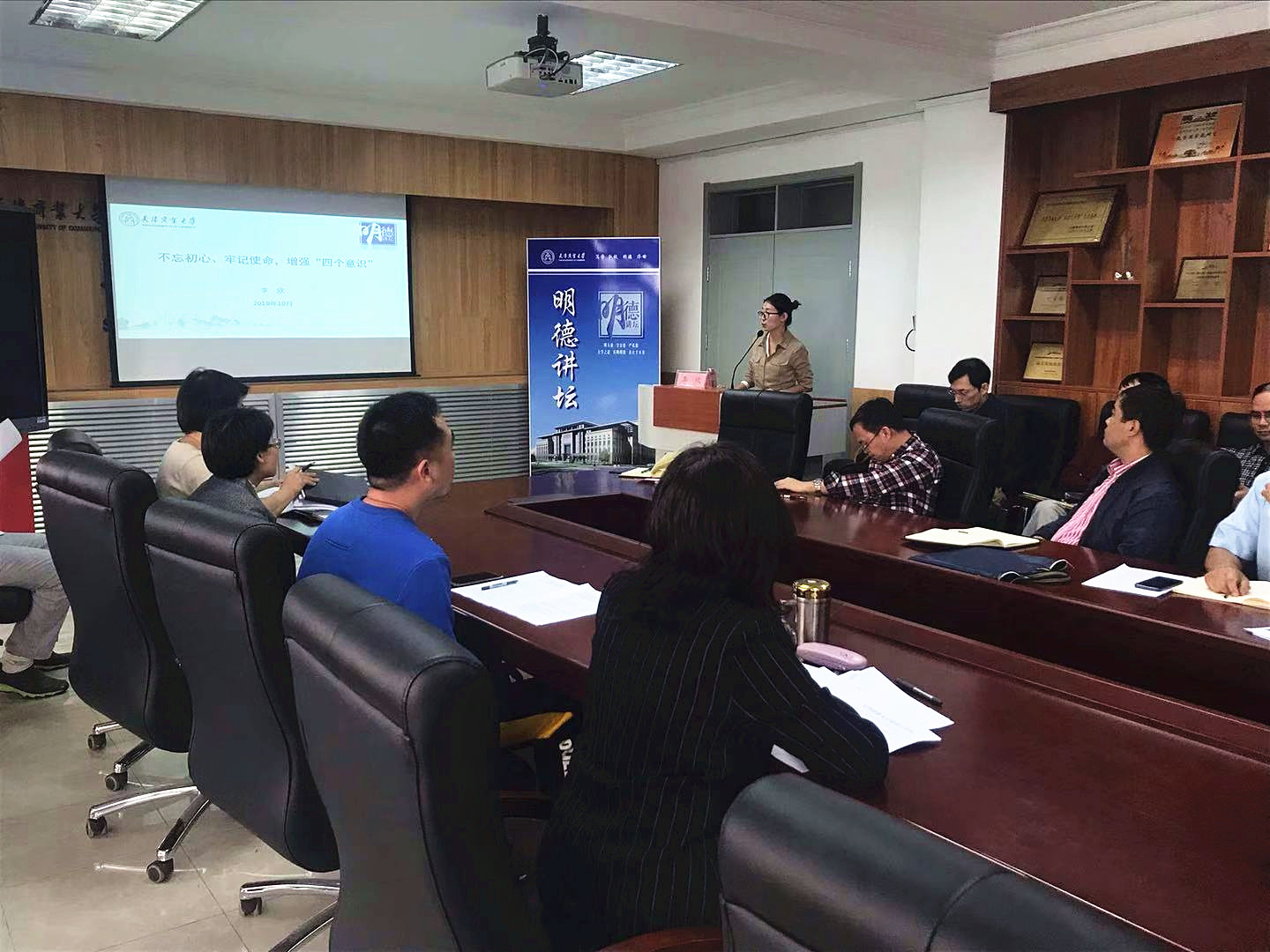 10月9日下午,bv伟德国际1946官网组织全体教职工参加了公司2019年下半年基层理论宣讲暨第八期“明德讲坛”,马克思主义公司李欣老师从“求真务实”、“苦难辉煌”、“接续奋斗”三方面进行讲授,引导大家从党史和新中国史中感悟党的初心和使命、不断增强“四个意识”来坚守初心勇担使命。