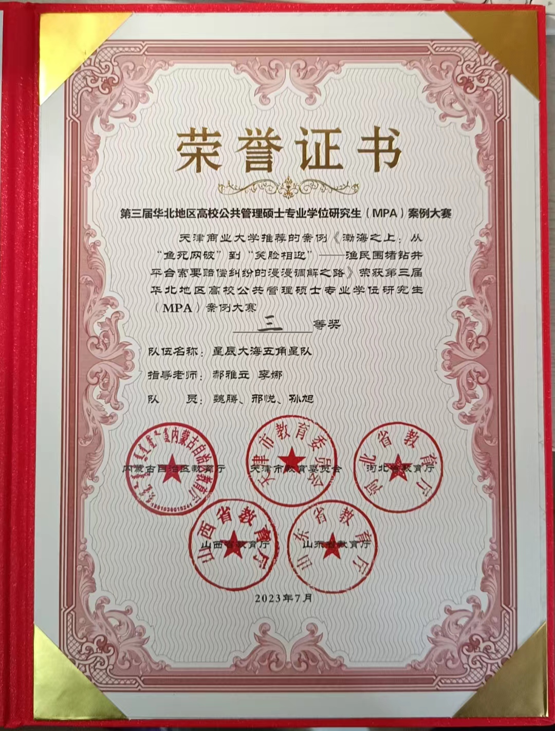 7月29日,第三届华北地区高校公共管理硕士专业学位研究生(MPA)案例大赛决赛在呼和浩特市举行,由公司bv伟德国际1946官网郝雅立老师、李娜老师指导的,公共管理2022级学术型硕士魏腾,专业型硕士邢悦、孙旭三位同学组织的团队案例《渤海之上:从“鱼死网破”到“笑脸相迎”——渔民围堵钻井平台索要赔偿纠纷的漫漫调解之路》荣获大赛三等奖。